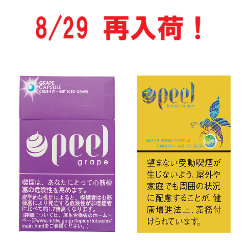 ピール・グレープ、レモンハニー 再入荷のお知らせ 大浦商店からのお知らせ 紙巻たばこ 2025/08/28更新 長らく欠品しておりました紙巻きたばこ ピール・スプラッシュ・グレープ、 ピール・レモンハニー 8月29日 再入荷決定しました。