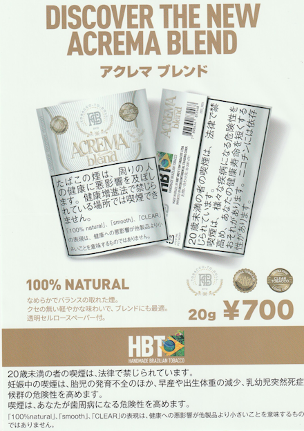 手巻きたばこ アクレマ・ブレンド 新発売! 大浦商店からのお知らせ 手巻たばこ 2025/12/18更新 手巻きたばこ アクレマ・ブレンド 新発売! クセの無い軽やかな味わいで、滑らかでバランスの取れた煙が特徴です。 透明なセルロースペーパー50枚付きです。 20g 700円
