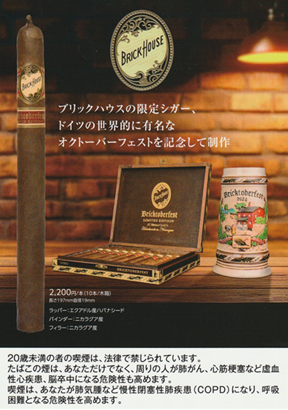ブリックハウス・ブリックトーバーフェスト 掲載しました。 大浦商店からのお知らせ 葉巻たばこ 2026/01/18更新 プレミアムシガー ブリックハウス・ブリックトーバーフェスト 掲載しました。 ハバナ・ロサード・ラッパーを使用。 ドイツのオクトーバーフェストをイメージして作られた限定シガーです。 サイズ 長さ:197mm 直径:19mm 2,200円