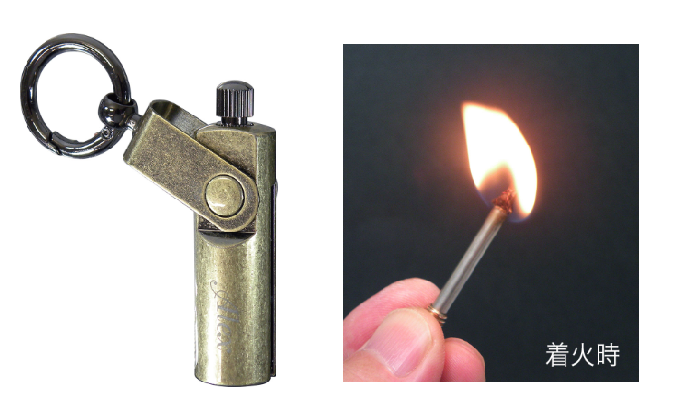 本体横のフリント部分に、芯棒を通常のマッチのようにこすり、火をつけます。